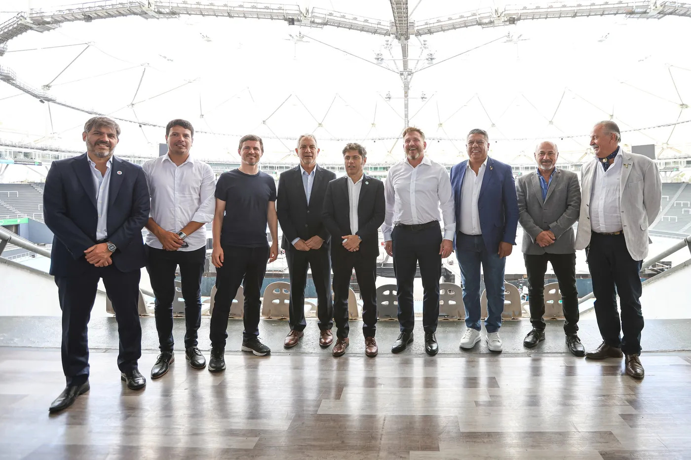 Axel Kicillof y Julio Alak recibieron a Chiqui Tapia y Alejandro Domínguez en el Estadio Único de La Plata que se prepara para ser sede internacional.