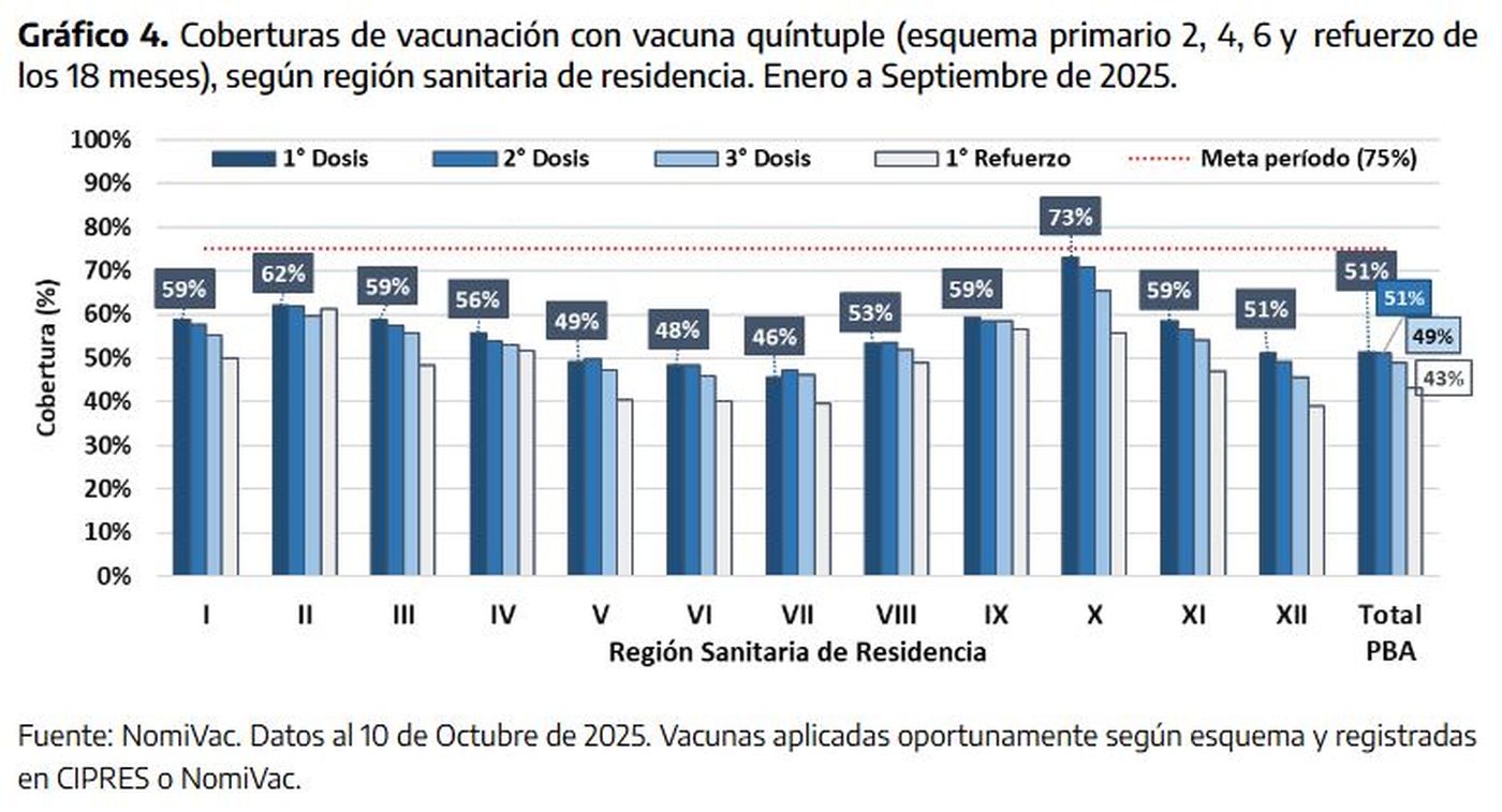 Durante 2024, la provincia alcanzó coberturas de entre 61,9% y 75,4% en las primeras cuatro dosis de la vacuna quíntuple, y 64,5% en embarazadas. Para 2025, el objetivo era llegar al 75% de la población objetivo, pero los registros de septiembre muestran niveles aún inferiores, especialmente en el Área Metropolitana.